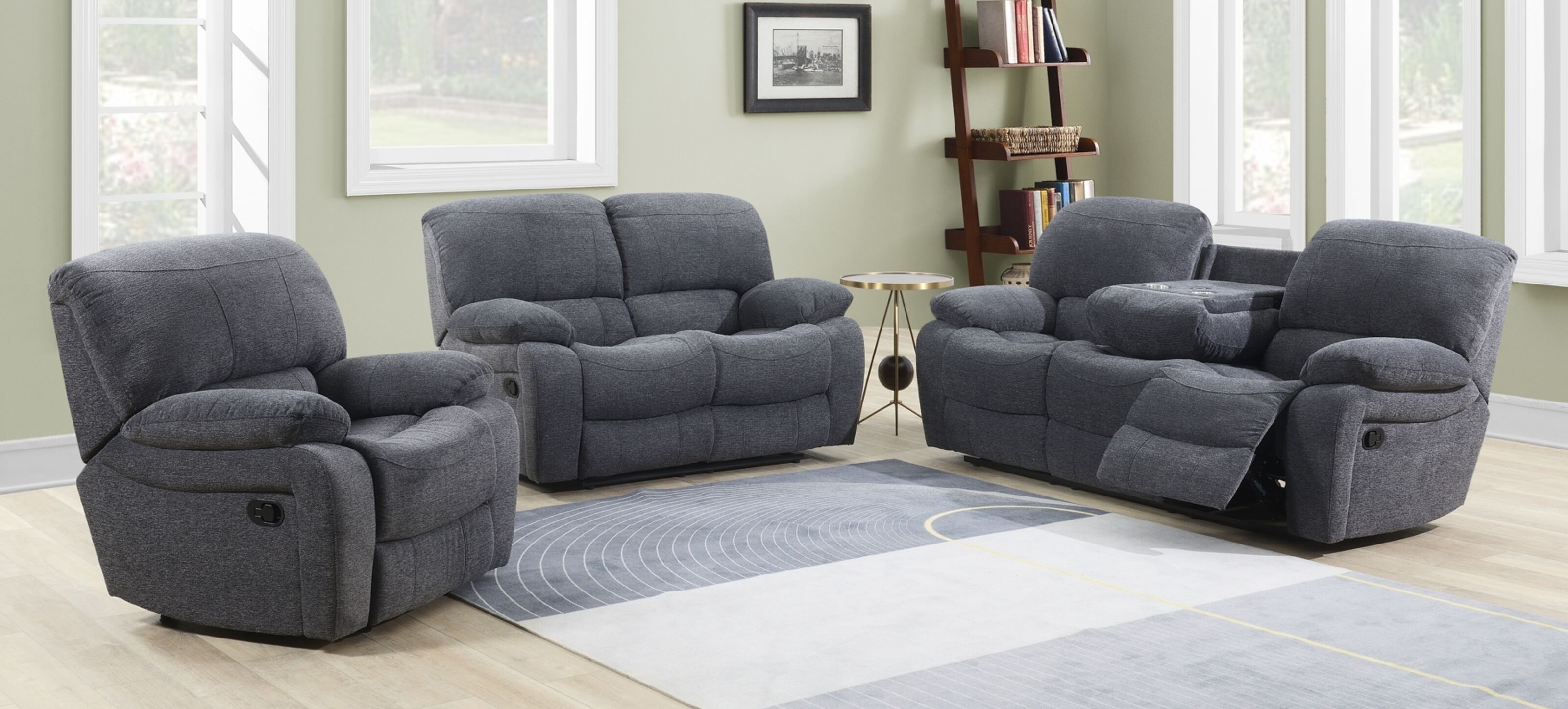 Transform your living room into a haven of comfort with this luxurious 3-piece reclining furniture set. Perfect for movie nights, game days, or cozy evenings with family, this set includes a reclining armchair, a dual-recliner loveseat 2 seater, and a spacious reclining sofa with a convenient center console with wireless charging pad. Upholstered in a rich charcoal gray fabric, this set is designed with padded armrests, cushioned head support, and smooth manual reclining mechanisms for the ultimate in relaxation.