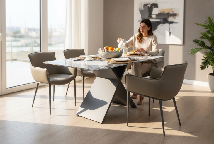 Elevate your dining space with this contemporary marble dining table that blends elegance with functionality.