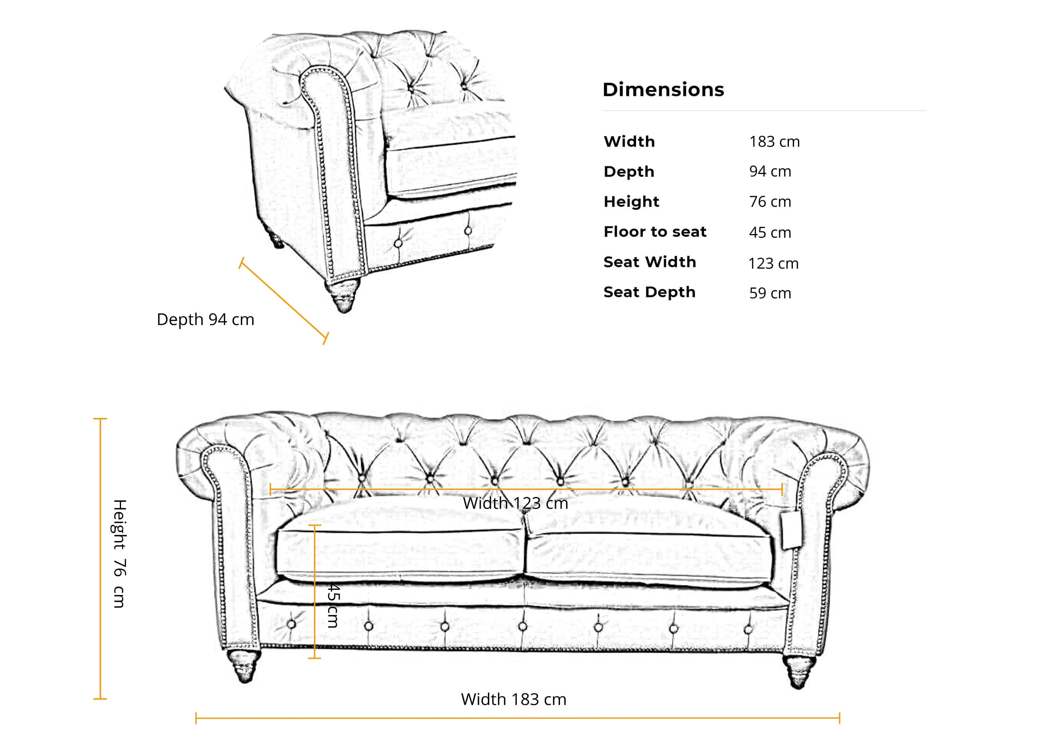 Dimensions (CM) 2 Seater  L183 X W94 X H76  Apprx