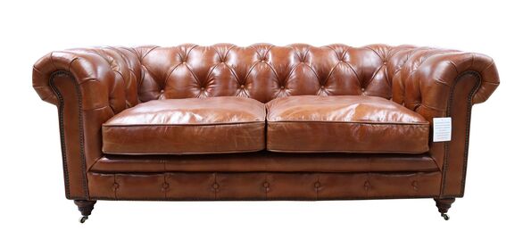 Add timeless elegance and comfort to your space with the Noble Chesterfield Club Chair. Crafted in real vintage tan distressed leather, this armchair features the classic deep button-tufting, rolled arms, and decorative brass nailhead trim that defines true Chesterfield style.