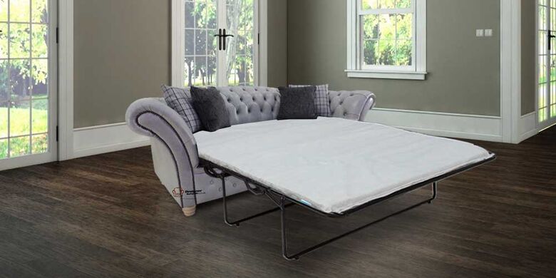 Pull Out Sofa Bed In Perla Illusions Grey Fabric Chrome Studding Chesterfield Cambridge 3 Seater Perla Illusions Grey Fabric Chrome Feet-Studding