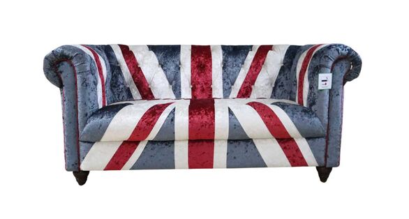 Make a bold statement with this stunning Union Jack Chesterfield Sofa, a perfect blend of British flair and luxurious comfort. Upholstered in high-quality crushed velvet, thisr sofa features the iconic Union Jack flag design in red, white, and blue for a standout piece in any living room, studio, or lounge.