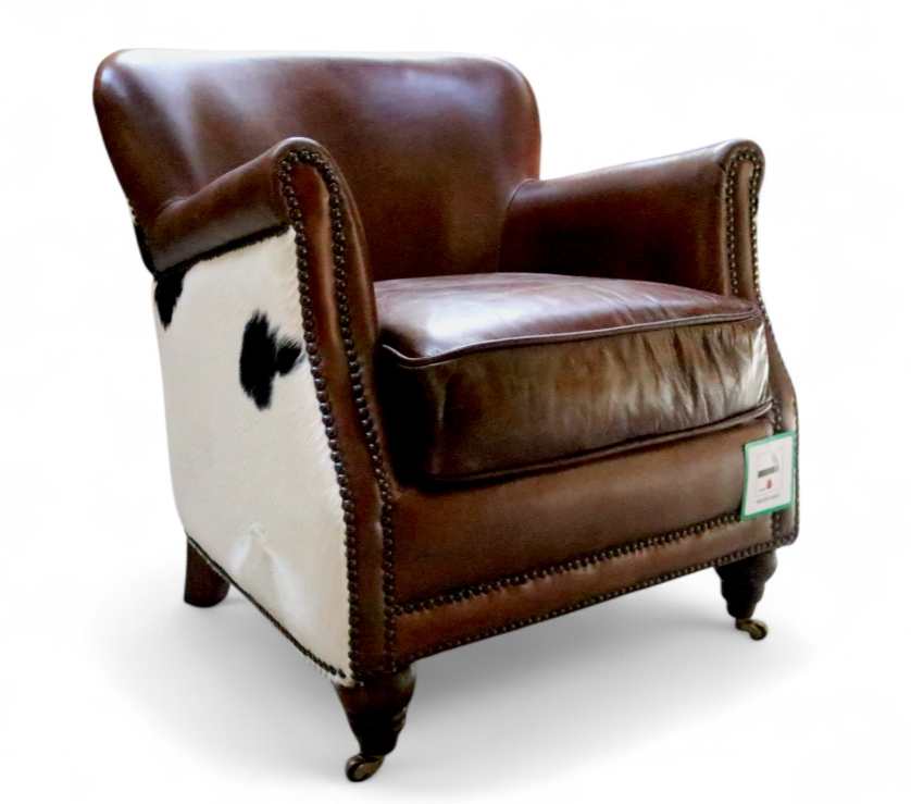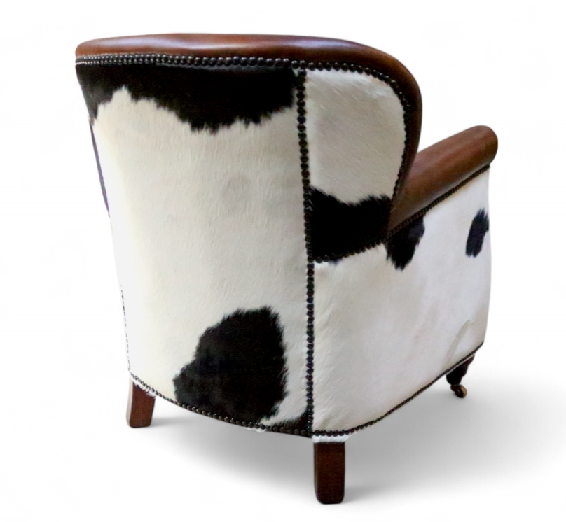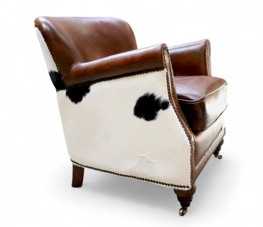 Bring timeless Western charm into your home with this stunning vintage tub chair. Upholstered in rich, top-grain distressed leather and accented with genuine hair-on-hide cowhide panels, this chair offers both comfort and character. The warm brown leather seat is generously cushioned, while the bold cowhide sides and nailhead trim add a rugged sophistication. Set on turned wooden legs with front brass castors for easy mobility, this piece is perfect for your living room, study, or man cave.