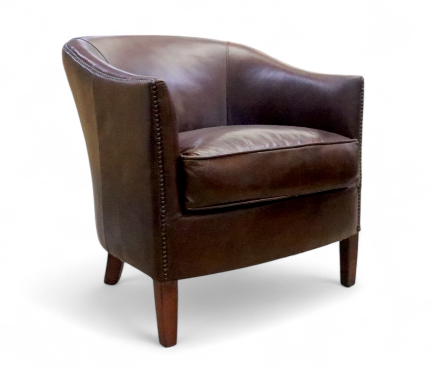 Add a touch of classic charm to your space with this beautifully crafted vintage leather tub chair. Featuring rich brown genuine leather, a supportive curved back, and brass nailhead trim, this chair combines timeless design with cozy comfort.