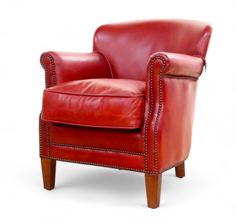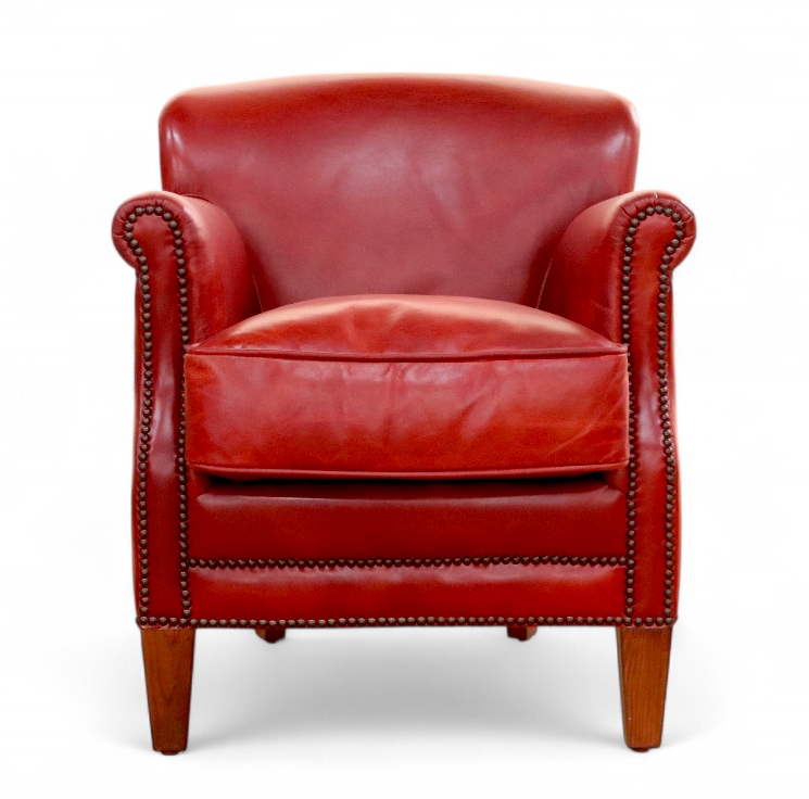 Add timeless elegance to your space with this classic vintage Red leather club chair. Crafted with top-grain leather and detailed with antique brass nailhead trim, this chair combines comfort with distinguished style. The plush seat cushion and gently flared backrest make it perfect for relaxing with a book or making a statement in your office or study.