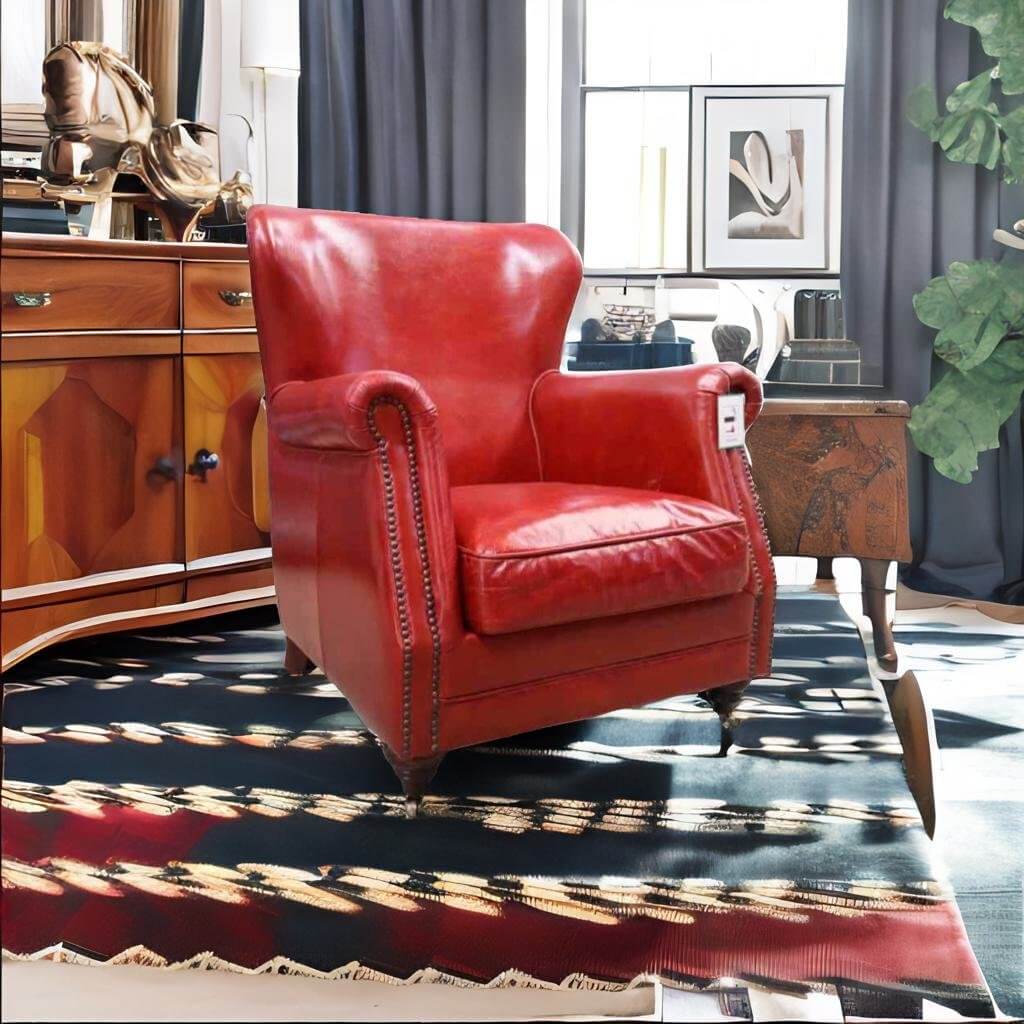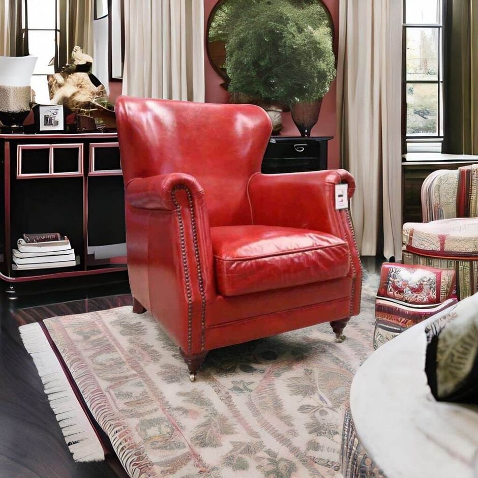 Add a bold statement piece to your space with this vintage high-back leather armchair in a stunning rouge red finish. Crafted with timeless elegance, this armchair features: