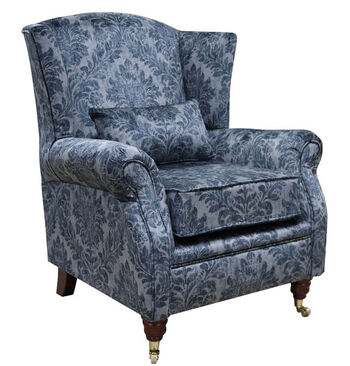 This traditionally styled wing chair has polyester fibre seat cushion and high tensile comfy cushions. Featuring hardwood Turned Mahogany Brass legs with rollers. Upholstered in Luxurious Designer Fabric exclusively available from Designer Sofas4u.
