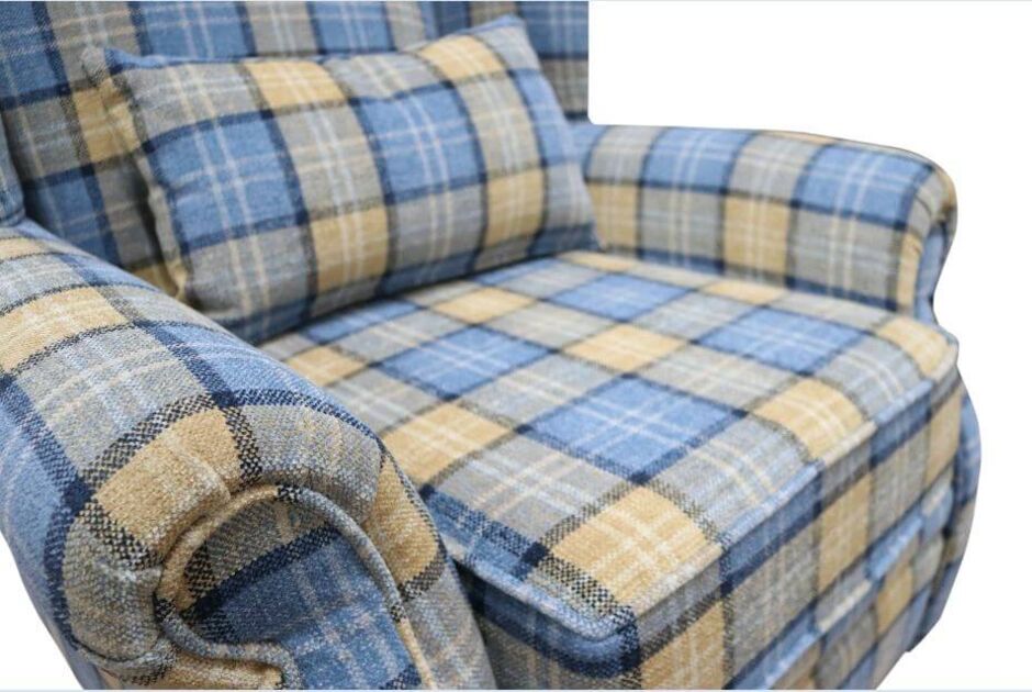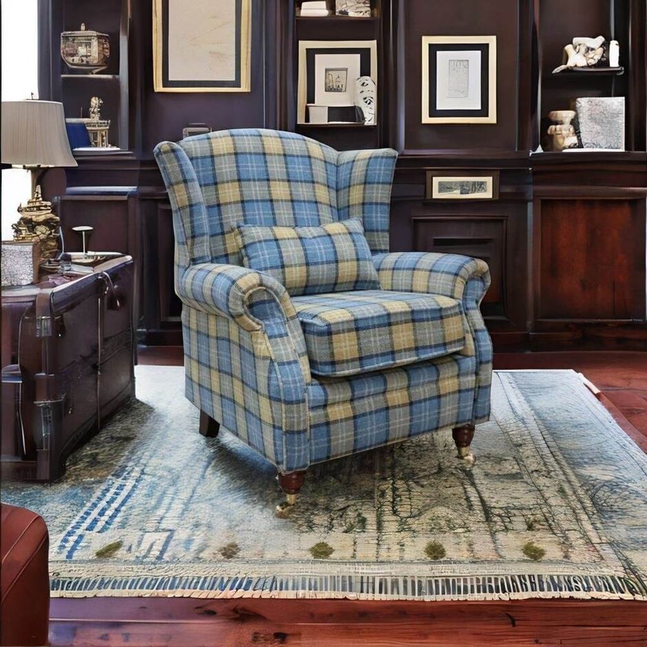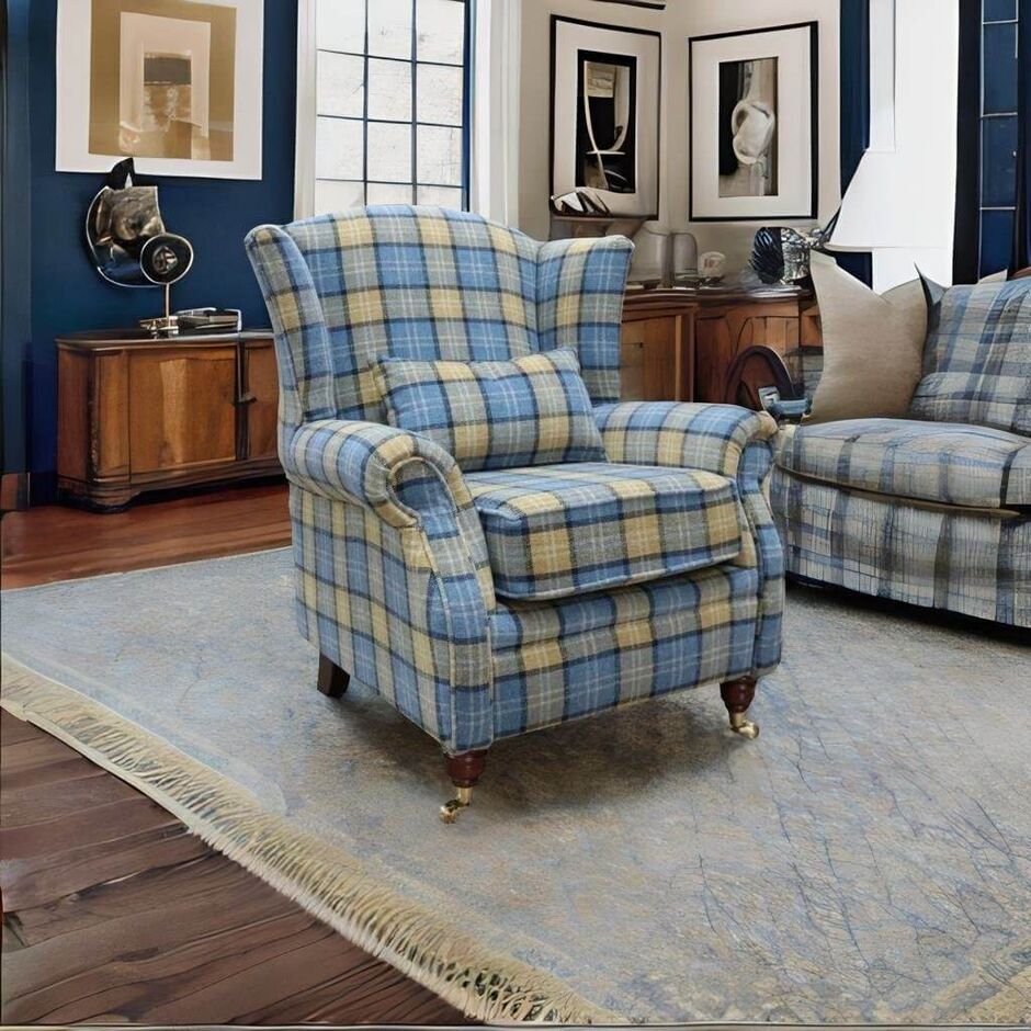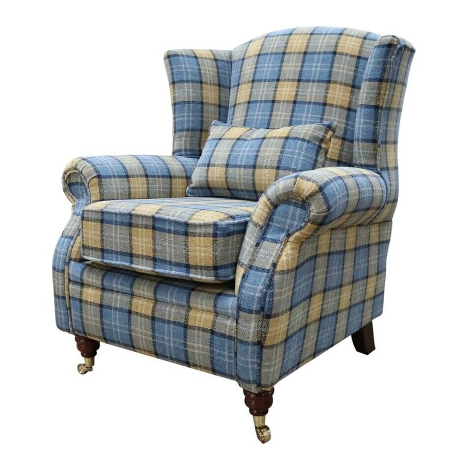 Lana Blue Check Fabric Wing Fireside High Back Armchair | DesignerSofas4U