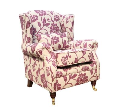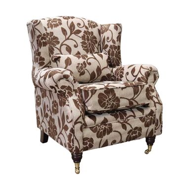 This traditionally styled wing chair has polyester fibre seat cushion and high tensile comfy cushions. Featuring hardwood Turned Mahogany Brass legs with rollers. Upholstered in Luxurious Designer Fabric exclusively available from Designer Sofas4u.