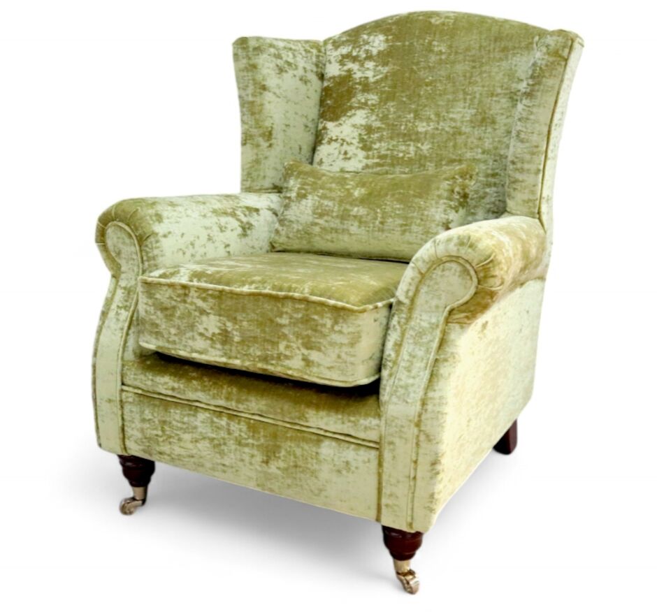 This traditionally styled wing chair has polyester fibre seat cushion and high tensile comfy cushions. Featuring hardwood Turned Mahogany Brass legs with rollers. Upholstered in Luxurious Designer Fabric exclusively available from Designer Sofas4u.
