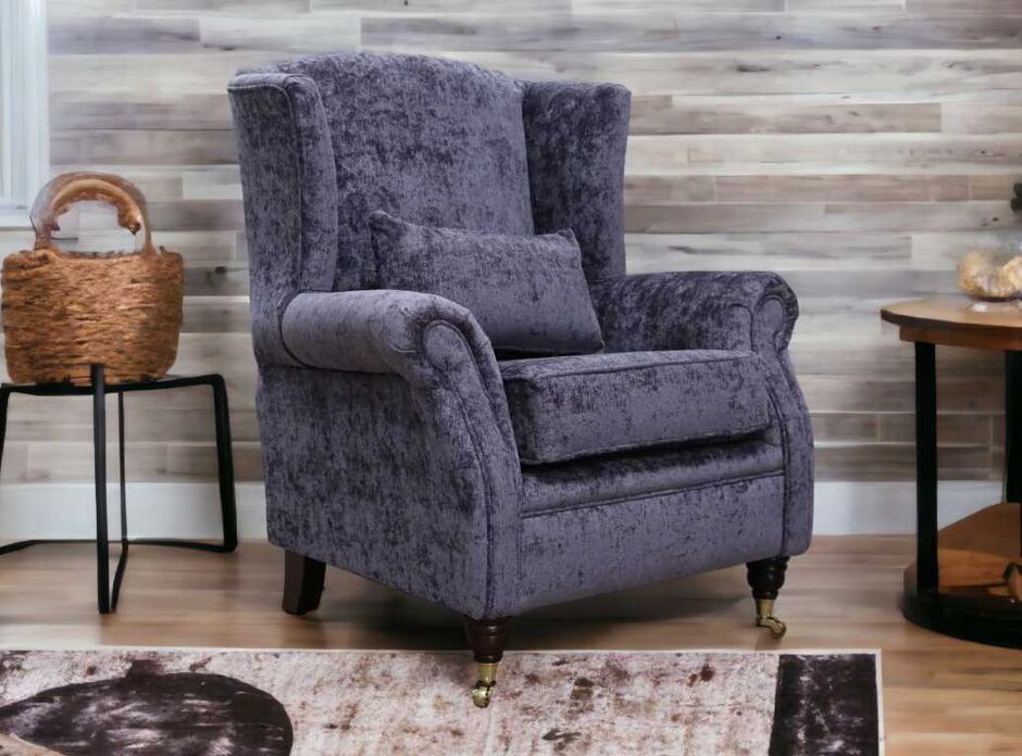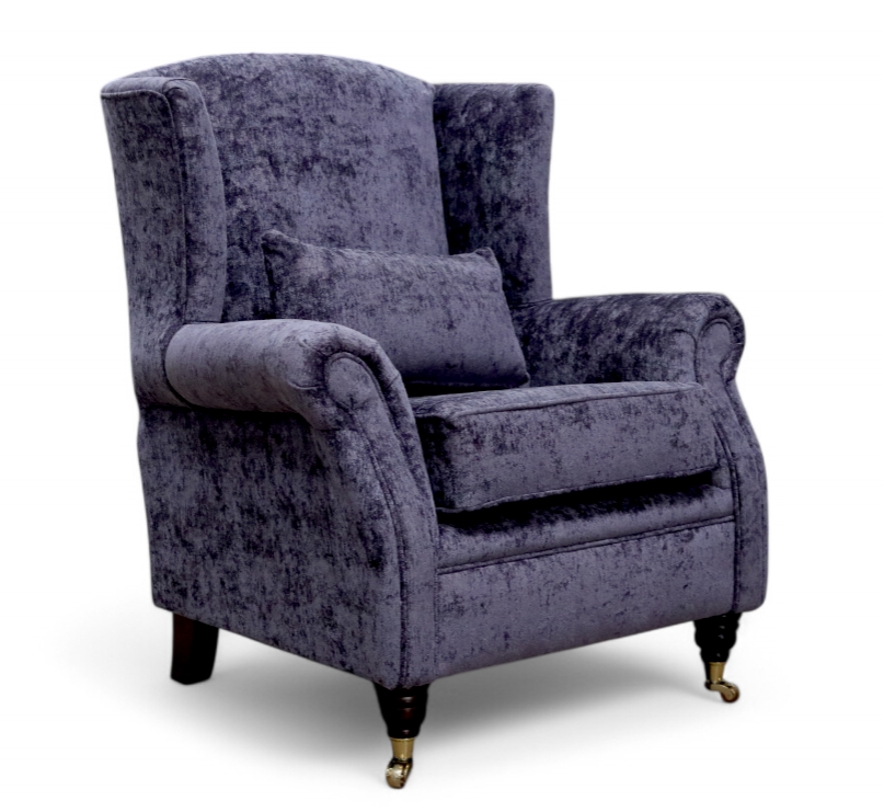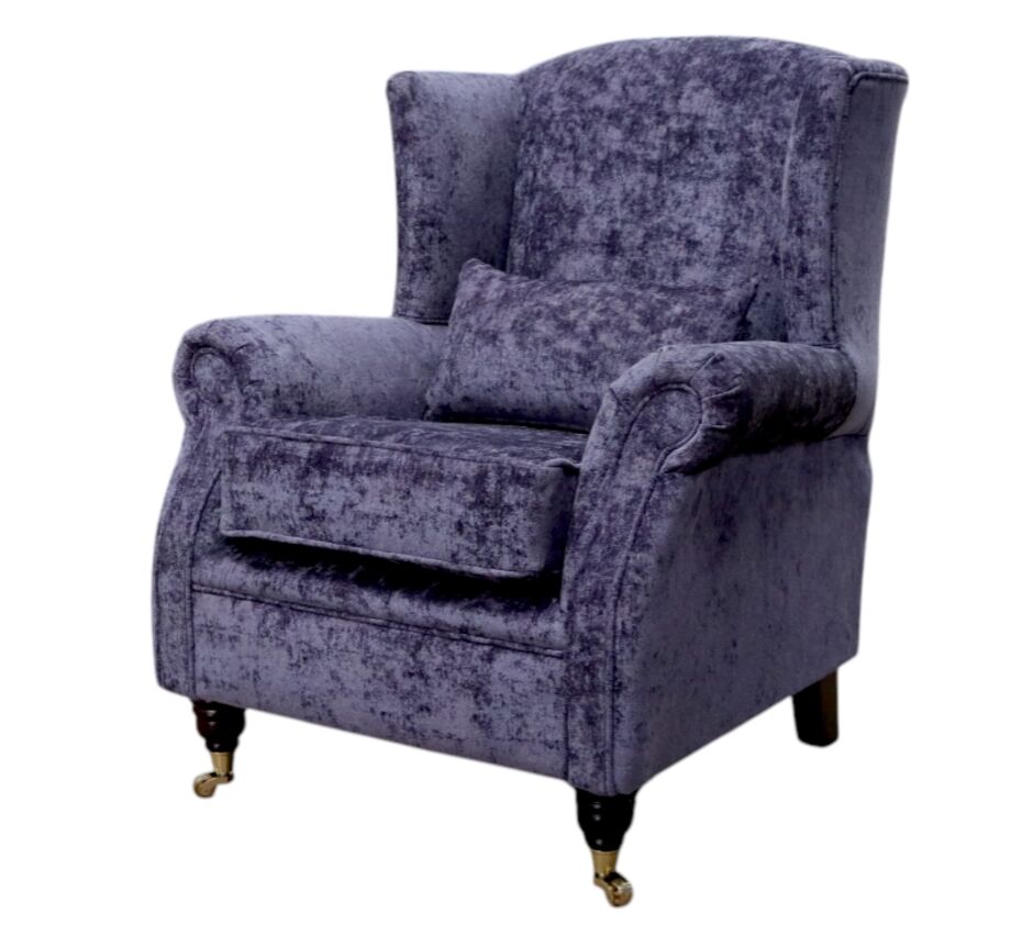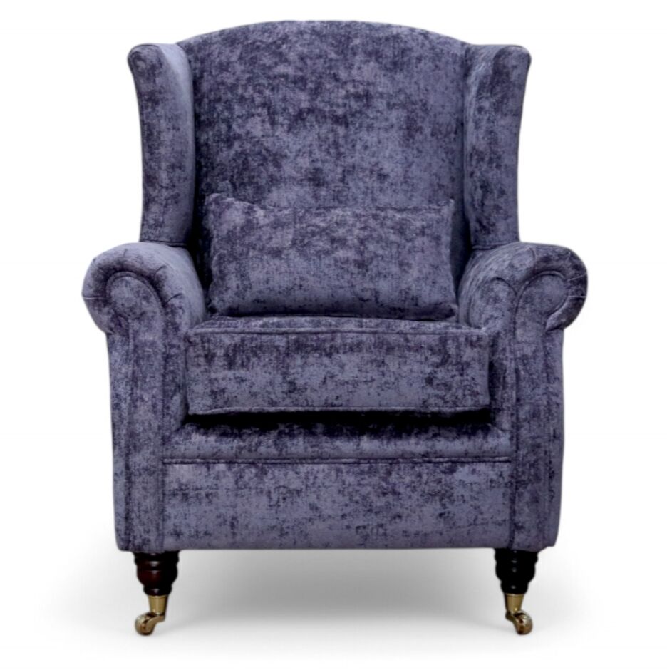 This traditionally styled wing chair has polyester fibre seat cushion and high tensile comfy cushions. Featuring hardwood Turned Mahogany Brass legs with rollers. Upholstered in Luxurious Designer Fabric exclusively available from Designer Sofas4u.