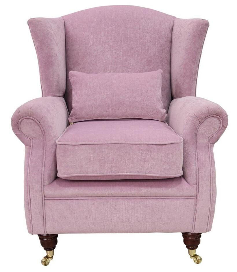 This traditionally styled wing chair has polyester fibre seat cushion and high tensile comfy cushions. Featuring hardwood Turned Mahogany Brass legs with rollers. Upholstered in Luxurious Designer Fabric exclusively available from Designer Sofas4u.