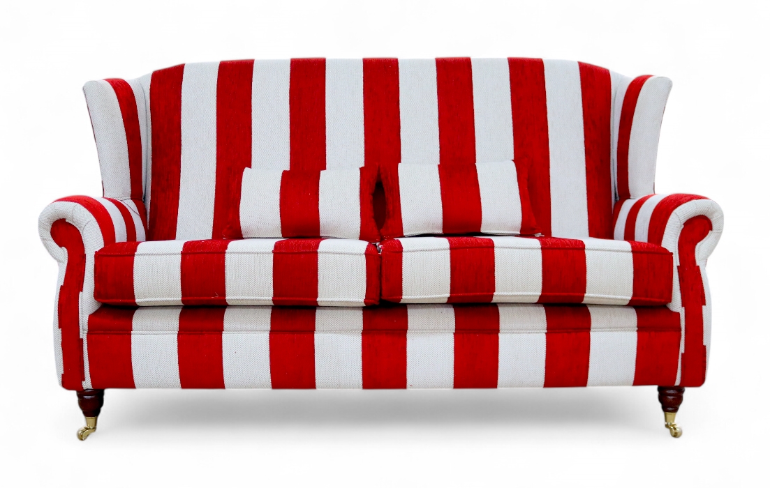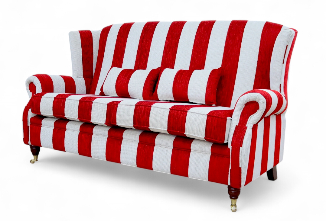 Make a bold statement in your living room with this striking Wingback 3-Seater Sofa upholstered in luxurious Harrison Stripe Ruby fabric. Featuring vibrant red and cream vertical stripes, this eye-catching piece blends vintage flair with contemporary style.